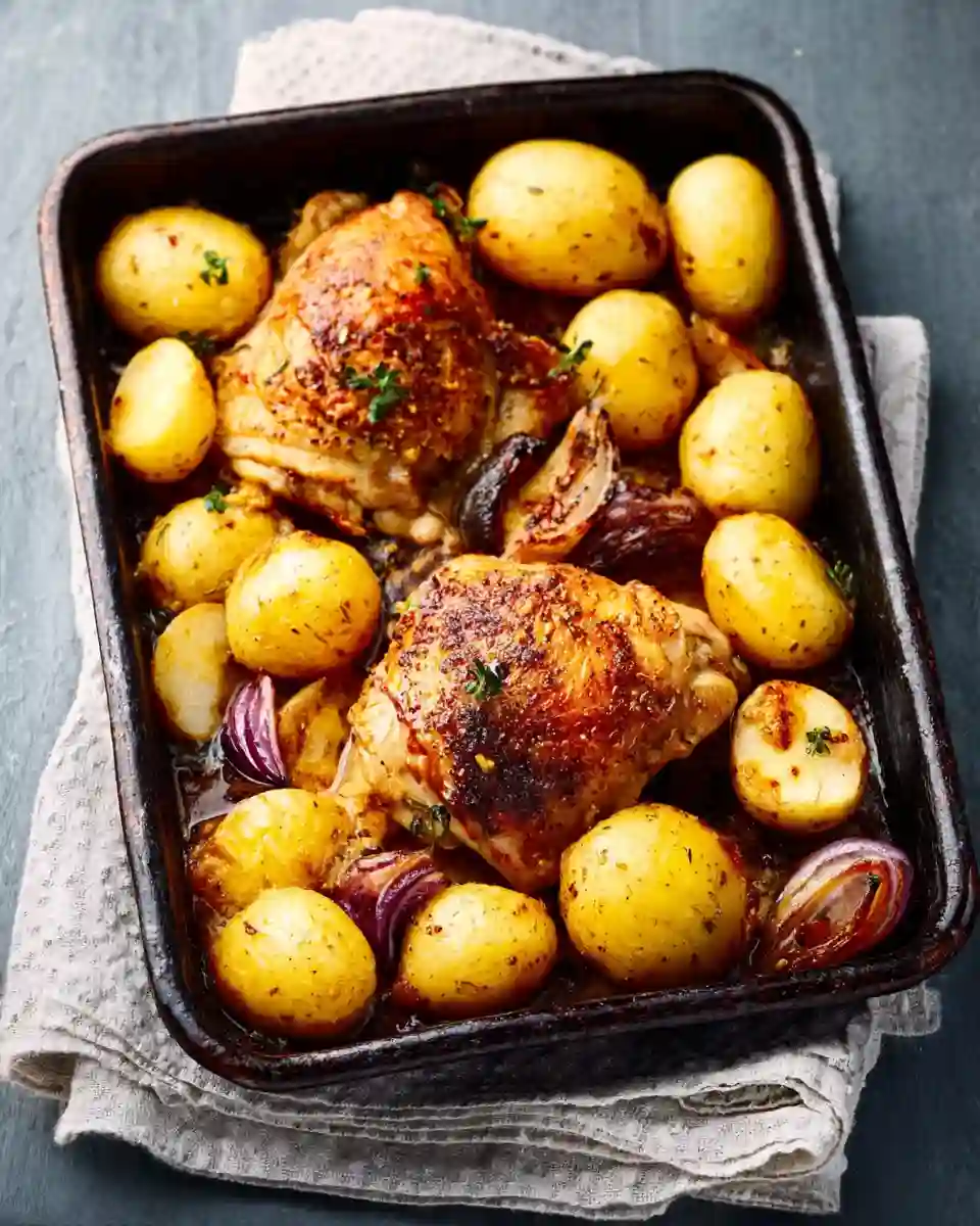 - Déposez tous les ingrédients dans un grand plat à gratin : pommes de terre, oignons, ail, puis cuisses de poulet par-dessus.